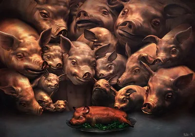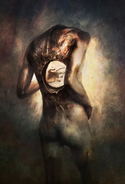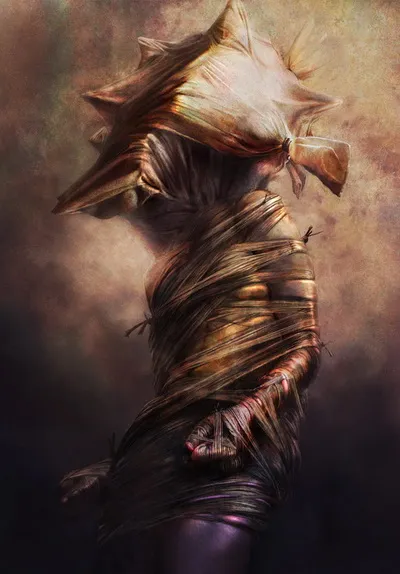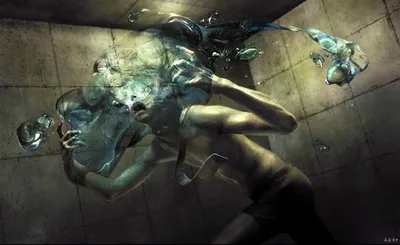 Стилистически Рюхей наследник таких признанных мастеров хоррор жанра как Масахиро Ито и Такаёши Сато (про них я еще напишу, когда буду делать пост про арты к Сайлент Хиллу). Человек с кроличьей головой - явная отсылка на этих мастеров, плюс - заигрывание с постмодерном и легкий привет коллегам по цеху. (Он очень мило поздравил своих поклонников с наступающим, надо сказать - главная страница официального сайта тому примером). Вообще же в его творчестве ощущается влияние не только игровой японской индустрии, но и классиков - приглядевшись в работах можно найти чисто Босховскую "адскую суету и смятение". Здесь очень мало игры контрастов, персонажи "вырастают" из фона словно появляются из мрачного тумана подсознания, а сюрреализм обладает чертами больного кошмара и зачастую неприятно физиологичен.