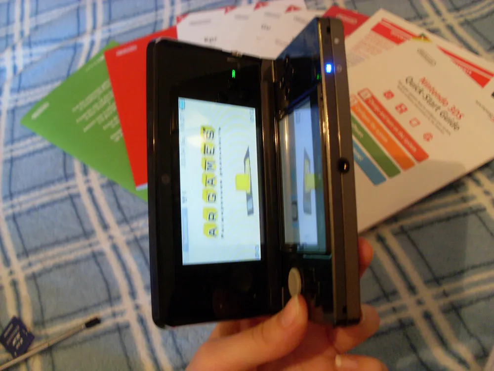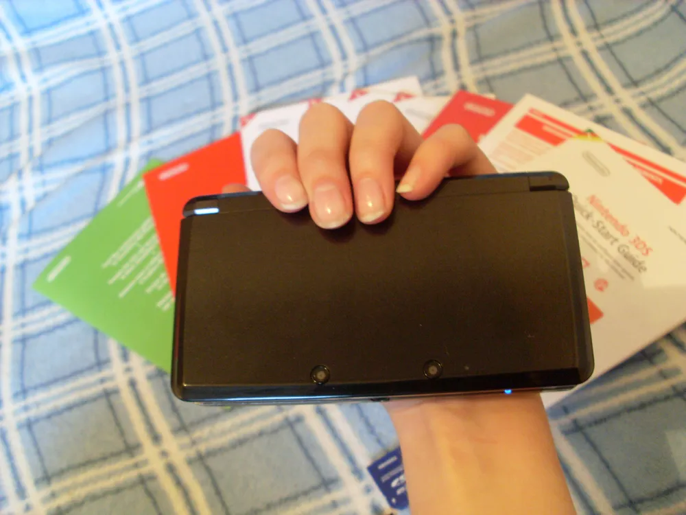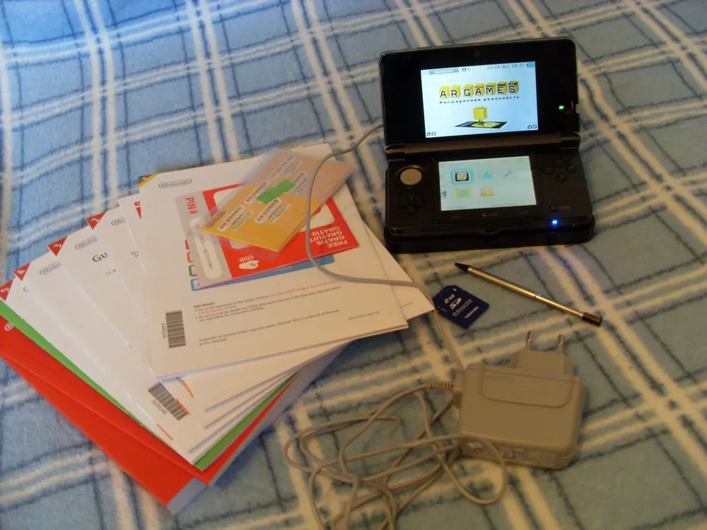 Итак, новая приставка является логичной наследницей Nintendo DS/DS Lite/DSi. Точно такой же раскладной формат, те же два экрана, нижний из которых сенсорный, полная совместимость с картриджами для DS. Доступны две цветовые вариации корпуса – полностью черная «Космическая Ночь» и «Аквамарин» с небесно-голубой нижней половинкой. Поставляется приставка в огромной коробке, примерно в 2 раза большей, чем коробка от DSLite. Однако почти половину места в упаковке 3DS занимает ворох бумаг, включающий в себя «Руководство пользователя» на 500+ (!) страниц. Среди бумажек есть и две полезные вещи. Первая: карточка на некоторое количество Nintendo Points, за которые можно приобретать игры/приложения в онлайн-магазине Nintendo. Вторая – игровые карты AR-games, о которых будет сказано позже. Кроме макулатуры и непосредственно консоли, в коробке обязаны лежать два предмета для зарядки 3DS.