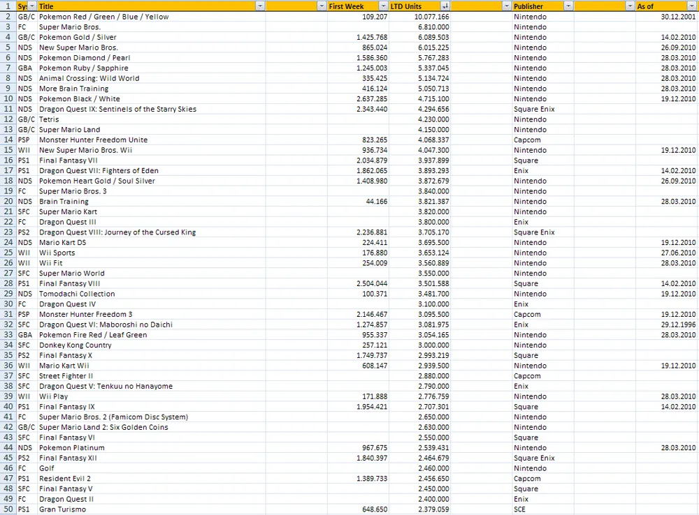На сайте Go Nintendo опубликовали таблицу, в которой перечислены пятьдесят самых продаваемых игр на территории Японии с момента ведения подобной статистики. Первое место досталось не Марио, а покемонам, которые всего заняли пять мест в первой десятке.