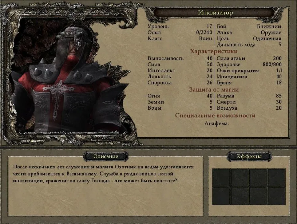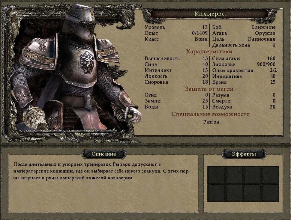 Наш славный рыцарь пересаживается на лошадку, меняет щит и меч на копьё и становится кавалеристом, что забавно, скорость передвижения его по прежнему остаётся меньше инквизиторской, не смотря на то что он верхом, а тот на своих двоих, видимо и вправду помогает инквизиторам сам Господь Бог (не сочтите богохульником), впрочем если приглядеться мы можем увидеть в специальных возможностях умение "разгон" что прибавляет 5 передвижения, а это весьма не мало, полезно если хотите побыстрее уничтожить магов, целителей и лучников противника.