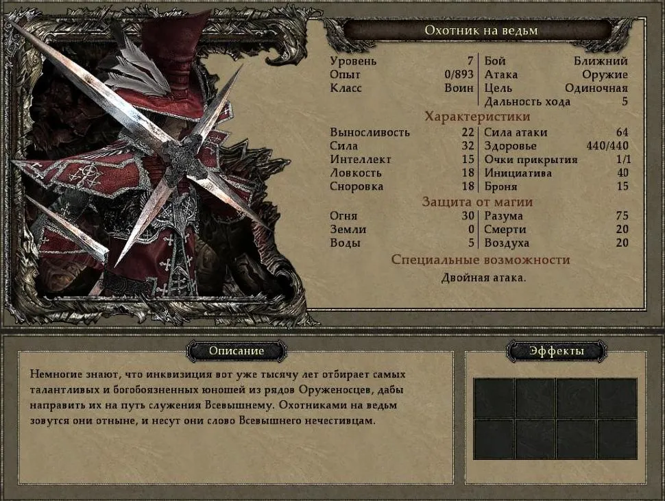 У охотника на ведьм мы видим очень хороший прирост к резистам, впрочем это логично, если вспомнить Дис2 где эта ветка как раз таки специализировалась на иммунитете к магии разума, а вот что удивляет, неожиданно появившаяся двойная атака, не скажу что это плохо, но это довольно неожиданно. Мы уже закрываем глаза на то, что после 1 уровня война, охотник на ведьм имеет сразу 7, так как система уровней в Дис3 по-моему не до конца понятна даже самим разработчикам, впрочем, кто знает, я пока что не смог разобраться.