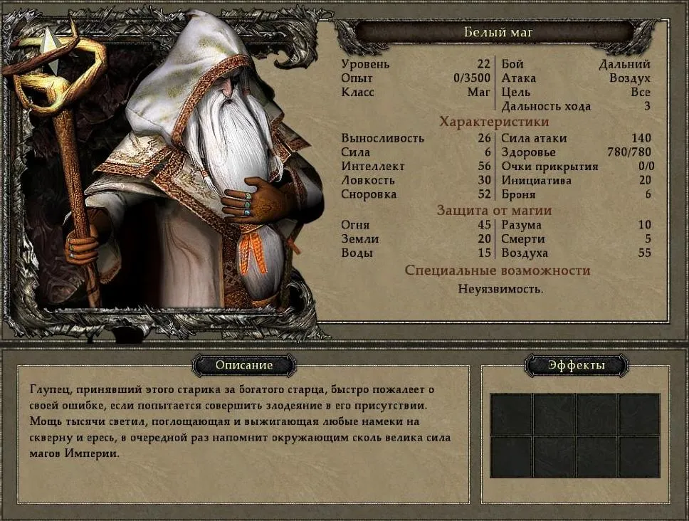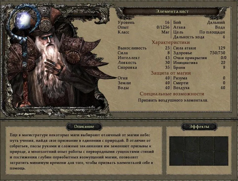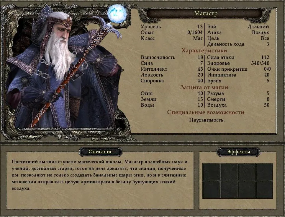 Но допустим нам лень париться и призывать каждый ход по одному элементалю, да ещё ходить за этого элементаля да ещё думать кого долбануть, тогда смело берём магистра и...о да...да да да! Наш маг наконец начинает бить по всем вражеским целям сразу, благодарю тебя Всевышний! Итак наш маг стал мега крут, как в старые добрые времена, конечно сила его атак чуть меньше чем у элементалиста, но при сражении с большой армией противника он становится намного эффективнее, так же получает умение неуязвимость, что позволяет ему с потерей хода безболезненно переносить атаки противника некоторое время