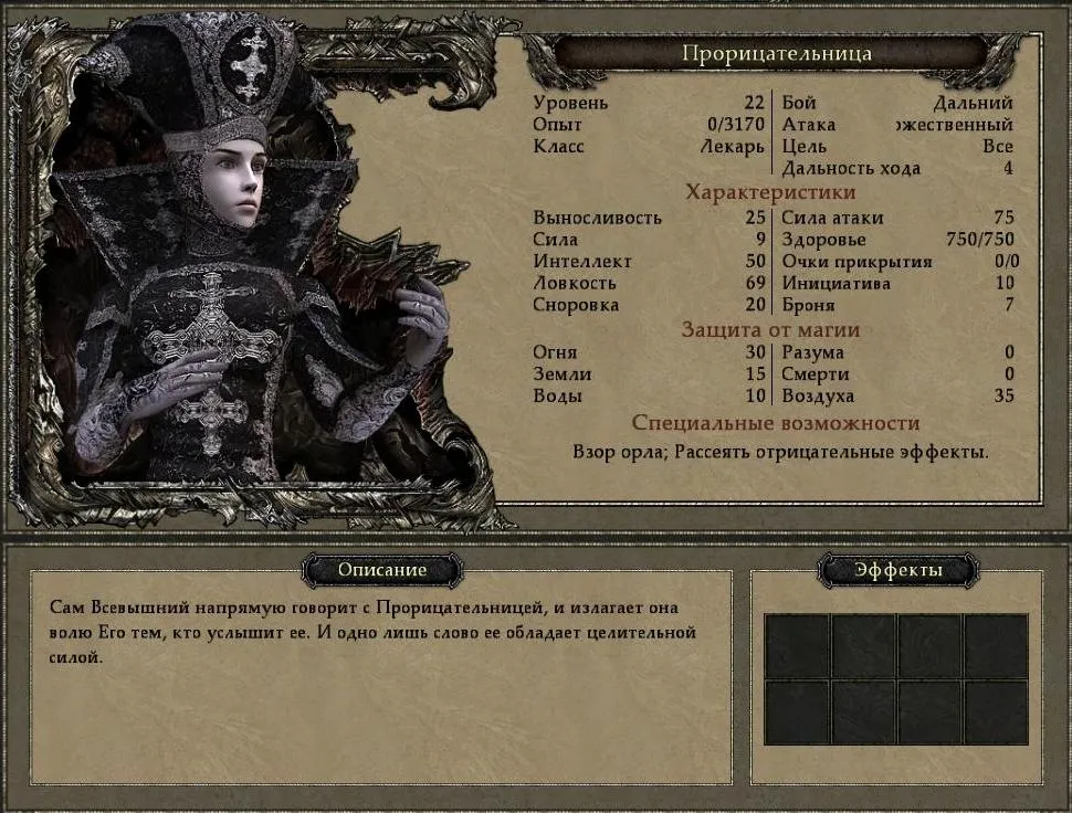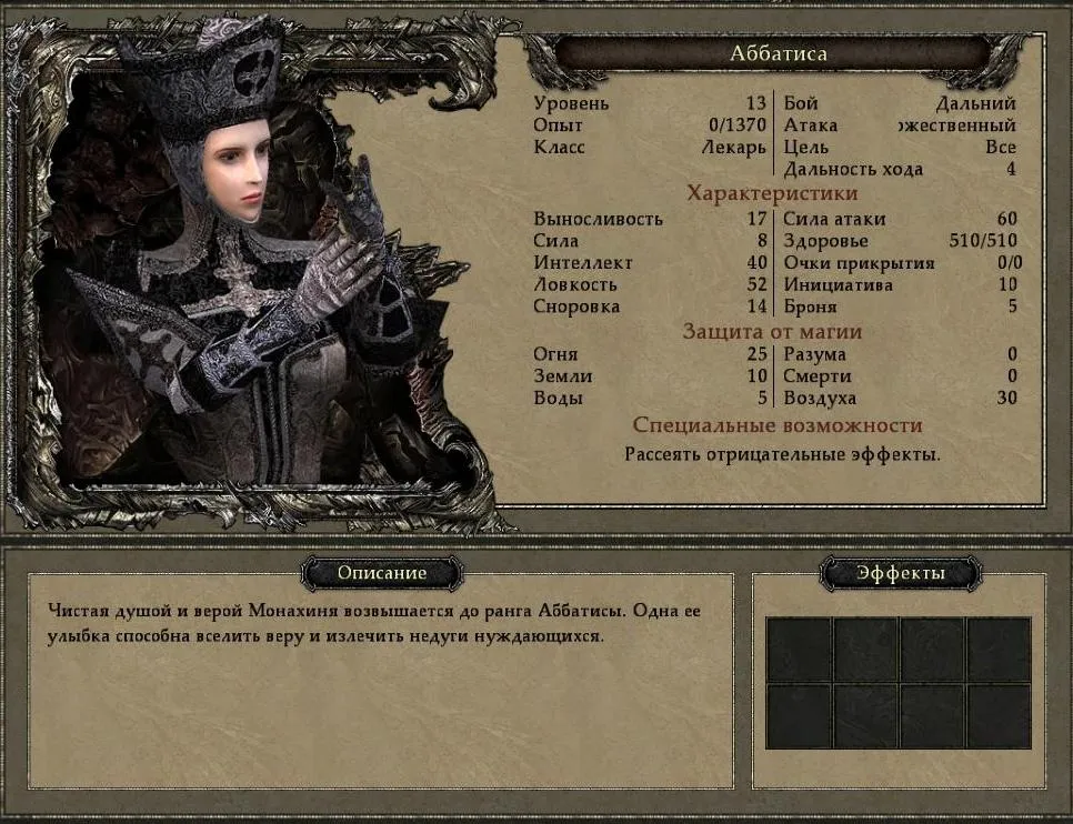 Всё то же самое что и у монахини, только сильнее, а так же новое умение, рассеять отрицательные эффекты. В отличии от Дис2 это умение является активным, применяется отдельно и только на одиночную цель, полезно редко, так как компьютер почти не использует дебаффы на ваших воинов