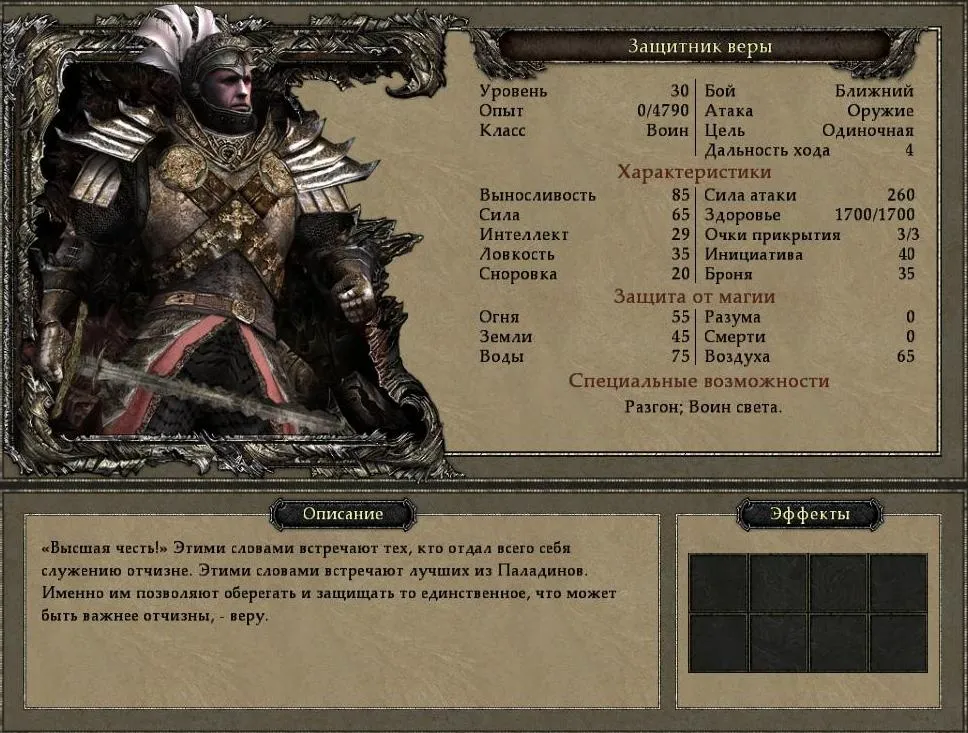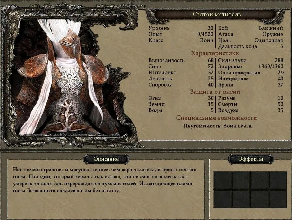 как я уже писал выше по сравнению со святым мстителем у этого юнита идёт упор на защиту, больше жизней, выше показатель брони, целых 3 очка прикрытия, этот юнит предназначен для держании урона на себе, эдакий танк вашего отряда, имеет всё тот же разгон, который потерял мститель, который позволяет проскакать ему в гущу врагов, тем самым заставляя их нападать на себя.