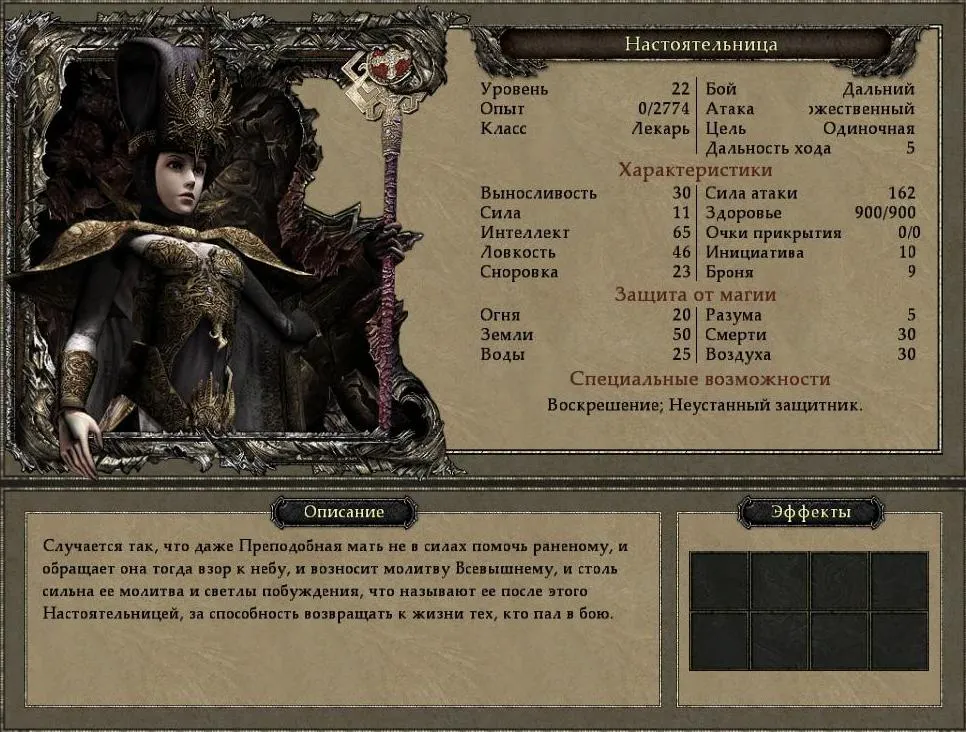 Настоятельница по сравнению со своими предшественницами имеет главное преимущество - воскрешение, весьма полезное умение, особенно в затяжных тяжёлых боях