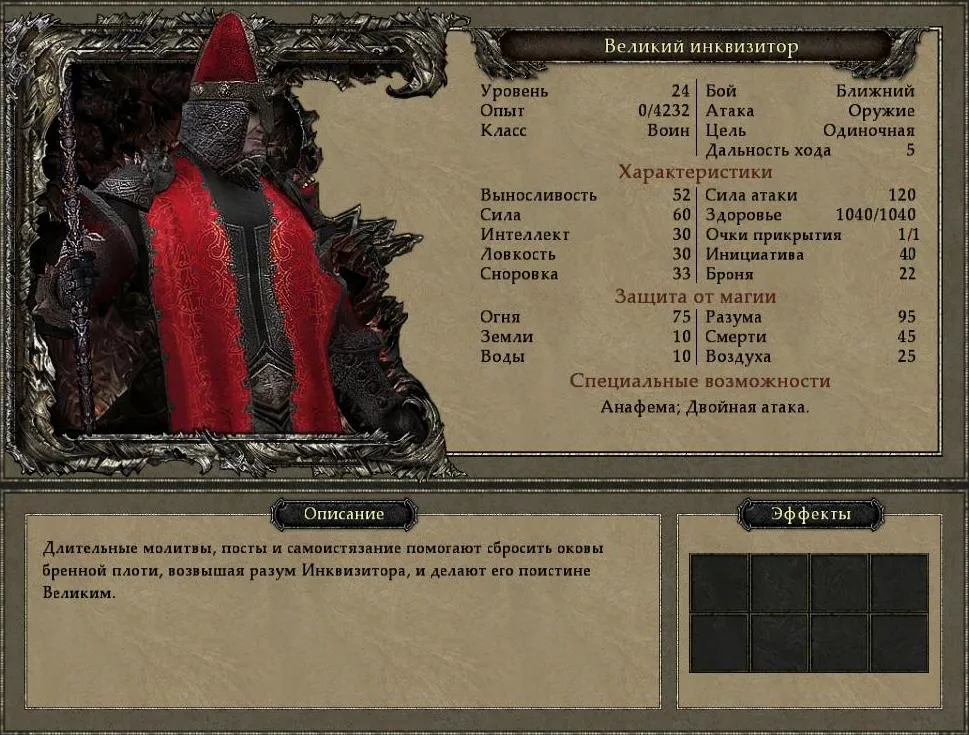 Приветствую ваше святейшество, ой что это? Неужели! Смотрим в специальные возможности...это шутка? Видимо разработчики решили что раз у нас инквизитор становится "великим" то ему вполне по статусу положено наносить два удара, поэтому утерянная двойная атака возвращается, и при этом не теряется анафема, потрясающе! Ну а если серьёзно, видимо пользуюсь какой-то загадочной логикой, разработчики решили так распределить по уровням умения инквизиторской ветки, хотя какая тут логика непонятно (впрочем как и с уровнями). Собственно добавлять что-либо не имеет смысла, функциональность юнита не изменилась.