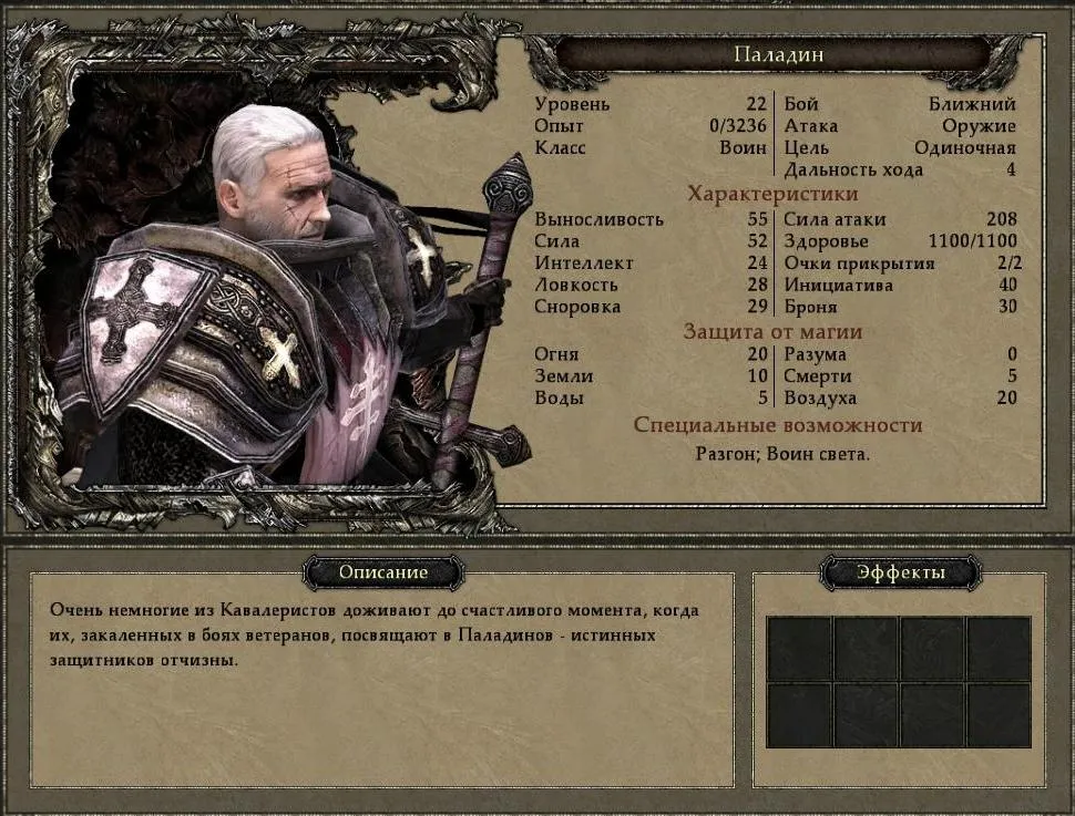 Ладно, если не хотим брать ангела, вернёмся к ветке земных тварей...ой то есть рыцарей, короче не будем становится богоподобными существами. Преимуществ у паладина по сравнению с ангелом весьма мало, чуть больше здоровья, чуть больше брони, меньше атака, меньше уровень, вместо телепортации остаётся разгон как и у кавалериста, ну и он так же имеет в характеристиках "воин света", не густо, впрочем он может развиваться дальше в одном из двух направлений, что видимо и даёт ему право на существование.