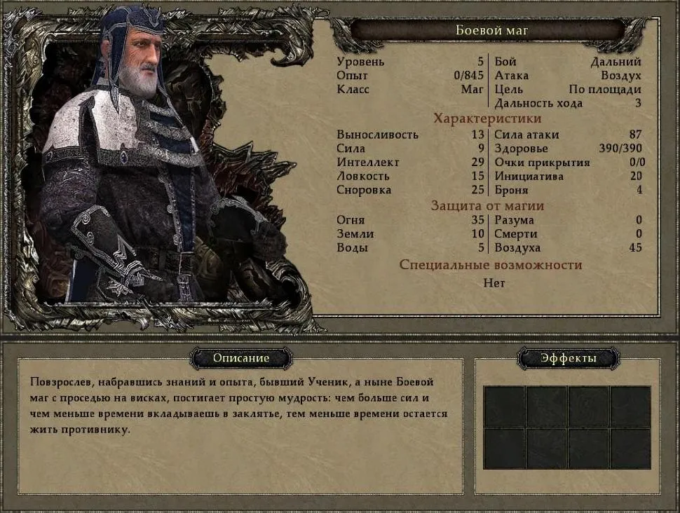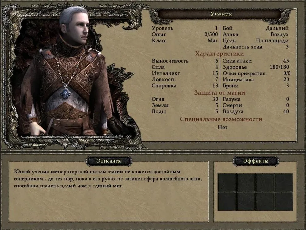 Не буду ничего про него говорить, наш ученик резко стареет, седеет, обрастает бородой, но по прежнем убьёт по площади, видимо извилин пока не хватает бить по всем, разница между учеником и боевым магом только в увеличение показателей параметров