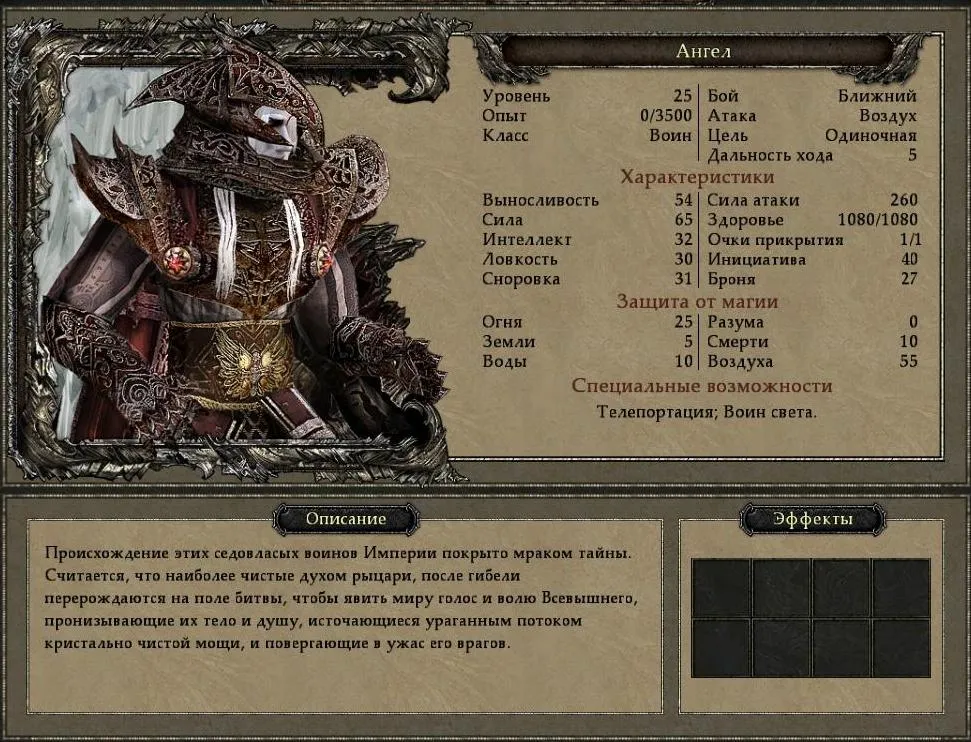 Если пойти по пути ангела, то мы завершим ветку прокачивания нашего война, и кого же мы получим. Не смотря на то что наш рыцарь слезает с лошади дальность его хода становится выше на единичку, видимо новоприобретённые крылышки помогают, а так же меняется тип атаки, персонаж остаётся типом "воин" (то есть для усиления дотами необходимо использовать точку сосредоточения война), тип атаки становится "воздух", на самом деле трудн осказать хорошо это или плохо, с одной стороны такие враги как оборотни становятся более уязвимы для вашего отряда,а так же показатель брони противника игнорируется, с другой стороны если у противника высокий резист к магии воздуха (элементаль воздуха), то остаётся полагаться на героя и лучников в бою. Умение телепортация, полезная вещь если хотите мигом "прыгнуть" в тыл противника, но так как идёт сразу потеря хода, желательно чтоб ударные отряды были где то в середине поля боя. Умение "Воин света" является пассивным и даёт...неизвестно что, честно я так и не понял в чём его бонус, видимо усиление урона при сражении с проклятыми, но не уверен, если кто знает напишите