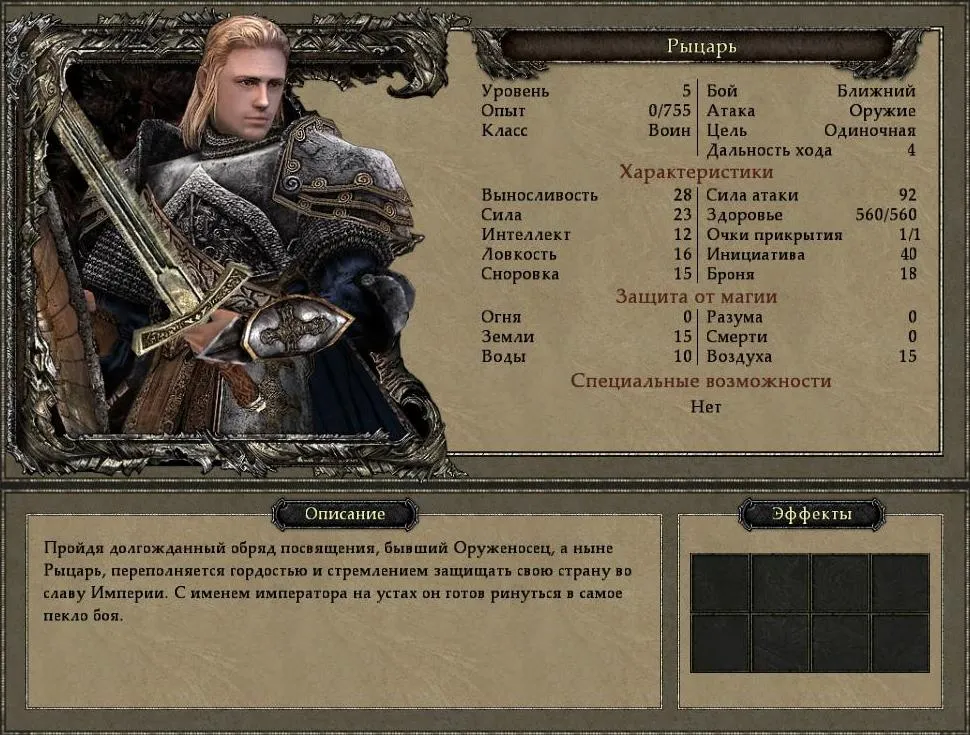 В отличии от охотника на ведьм имеет побольше хп, чуточку больше брони, ниже резисты и выше атак...на первый взгляд, вспоминаем что у охотника двойная атака, простая арифметика и...вывод, атака всё же ниже, ну ничего, зато рыцарь более живуч) Хотя есть ещё один минус, дальность хода рыцаря меньше чем у охотника на ведьм, всё же теперь в disciples в бою используется передвижение и не стоит забывать про этот параметр, впрочем...впрочем всё равно пока компьютерный интеллект оставляет желать лучшего можно просто подождать, подманив воинов противника поближе и спокойненько их покромсать.