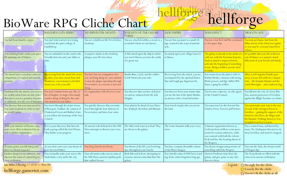 Еще одна таблица, в которой собраны главные жанровые клише BioWare. Взглянув на нее, вы увидете, что почти каждый проект этой знаменитой студии обязательно содержат в себе набор стандартных сюжетных решений - все зависимости от того где и когда происходит действие. В роли главного героя чаще всего выступает молодой и неопытный воин, а в завязке почти всегда присутствует "нападение на родную деревню", ставящее протагониста в сложную ситуацию- для спасения мира и разрешения других проблем герою надо посетить четыре ключевые локации, при этом очень часто дело не обходится без некой загадочной расы или цивилизации. В общем, Вы и сами все видите)