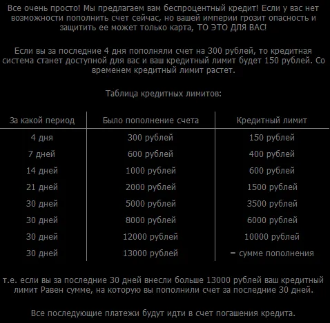 Наверное, у вас часто возникает желание сэкономить игровое время, нанести врагу неожиданный удар, когда он этого совсем не ждет или просто хочется халявных монет? - теперь вы можете взять у нашей компании беcпроцентный (бесплатный) и бессрочный кредит.