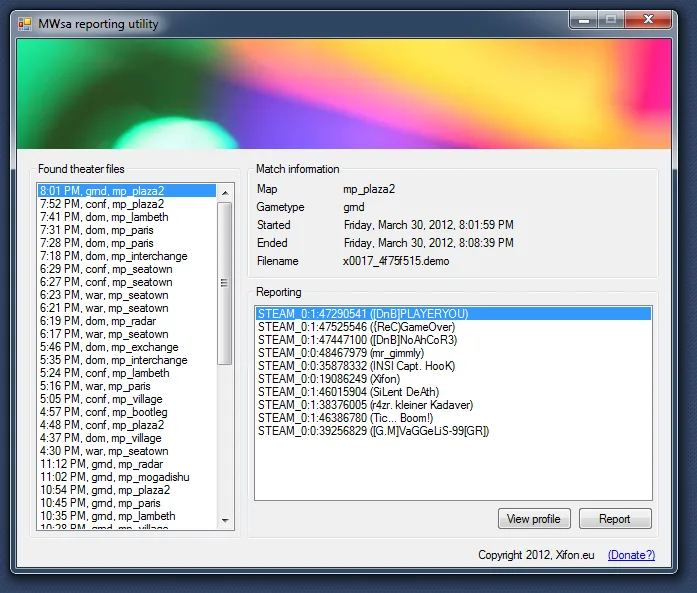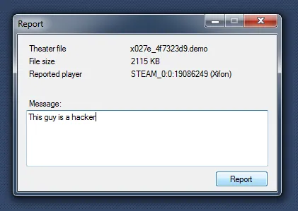А для облегчения репортов уже запилили прогу которая в полуавтоматическом режиме отсылает жалобу. Единственное что от вас требуется это зайти в профиль выродка читераса, чтобы запомнить его "в лицо" и потом, после игры, выбрав карту на которой вы с ним играли в левом окне программы и профиль читера в правом окне, просто нажать кнопку Report. В появившемся окошке написать короткое сообщение и еще раз нажать Report. Далее вы увидите как демка с указаным профилем и вашим сообщением отправиться на рассмотрение BanCandy.