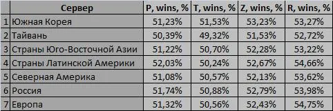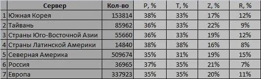 Больше всего народ любит протоссов, на пяти из семи серверов их выбирает самый большой процент игроков. Терраны занимают почётное второе место, в Европе и Латинской Америке даже немного опережая протоссов. Зерги в меньшинстве, на некоторых серверах их почти в два раза меньше, чем протоссов. Наибольшее количество верных слуг Королевы Клинков ведут бои на тайваньском и русском серверах. На последнем месте, разумеется рандомщики (причём меньше всего их в процентом соотношении на русском сервере - около 7%).