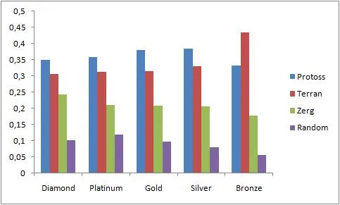 Как видно из диаграммы, процент терранов и протоссов уменьшается с повышением уровня лиги, за счёт роста процента игроков за зергов и случайную расу (в "Алмазе" процент рандомщиков несколько падает, но это связано с тем, что против сильных "однорасовых" игроков фактор неожиданности особо не решает).