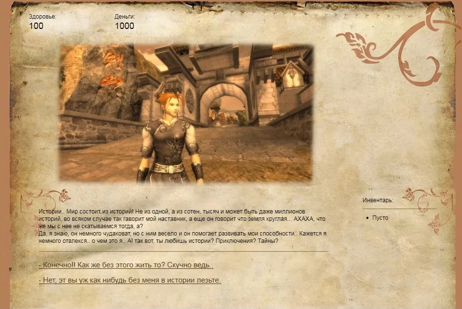 «История одного человека» - это фентези игра, более темная и суровая чем ее представители. Изначально идея которую я задумывал поменялась несколько раз и игра стала больше походить по стилистике на Dragon age. Так как я люблю критиковать игры, мне очень сложно создавать свои, чтобы они выглядели , так сказать , правильно. Поэтому не раз я менял некоторые хитросплетения сюжета, за время создания успел поменять систему боя. Раньше я хотел чтобы игрок все решал с помощью кубиков, но теперь проведя небольшой анализ, понял что, многие забьют на игру, потому что это занятие может оказаться слишком долгим, чем хотелось, поэтому в игре скорее всего будет использована система боя на подобие той, что вы могли видеть в квесте натальи. То есть просто по переходам по ссылкам. А игра все будет считать за вас. Пока возможности конструктора ограничены, поэтому игра делается довольно медленно. Мне хочется сделать ее не просто обычной ролевушкой, которую можно пройти за пару минут, а настоящей полноценной текстовой игрой. Вообще в это фентези я вложил наверное максимум своих фантазий и хочу чтобы игрок чувствовал себя свободным в мире, котором он окажется. По геймплею я черпал вдохновение из Oblivion. Ведь если вы играл в эту замечатльную РПГ, то знаете, что весь сок кроется в изучении мира, побочных квестах, и свободой воли. Примерно тоже самое я хочу показать в своем проекте. Каждое ваше действие и решение, будет иметь свои последствия. И это основа игры. Вы должны почувствовать, что мир изменяется от ваших действий.
