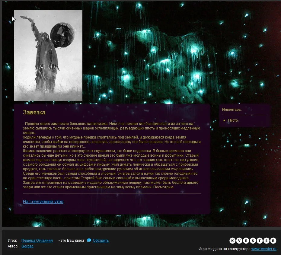 На проекте я недавно, но с самого первого дня заразилась идеей создания сложного и большого квеста.. Хочется что бы человек сел за игру в свободное время и посвятил ей полчаса как минимум и при этом ни капельки не разочаровался в потраченном времени, чтобы хотел переиграть в нее еще несколько раз дабы увидеть новые концовки, изменить свое поведение в игре и посмотреть как это повлияет на сюжет. Наверное, мне гораздо интереснее большие проекты, но на них уходит и больше времени.. На данный момент в разработке находятся три квеста над которыми я работаю и еще вагон и маленькая тележка задумок и планов на будущее =) Ну а теперь подробнее: