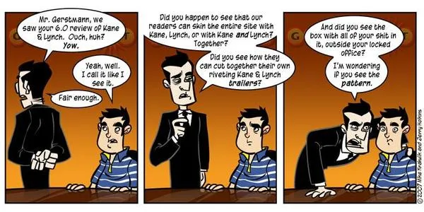 Из заголовка у вас не должно складываться превратное впечатление, что пресловутый журналист отмотал пятерик в частной подземной тюрьме игрового издателя и приковылял за свой старый стол. Дело было так. В 2007 году Джефф Джерстманн, один из пишущих редакторов GameSpot, написал рецензию на первую Kane & Lynch и дал ей оценку 6,0/10. Популярный портал тогда был густо залеплен рекламой этой игры, и — по слухам — издатель Eidos пригрозил снять рекламу, если не снимут Джерстманна. Так и вышло: Джефф был уволен по причинам, которые наниматель не пожелал раскрывать.