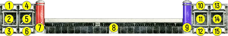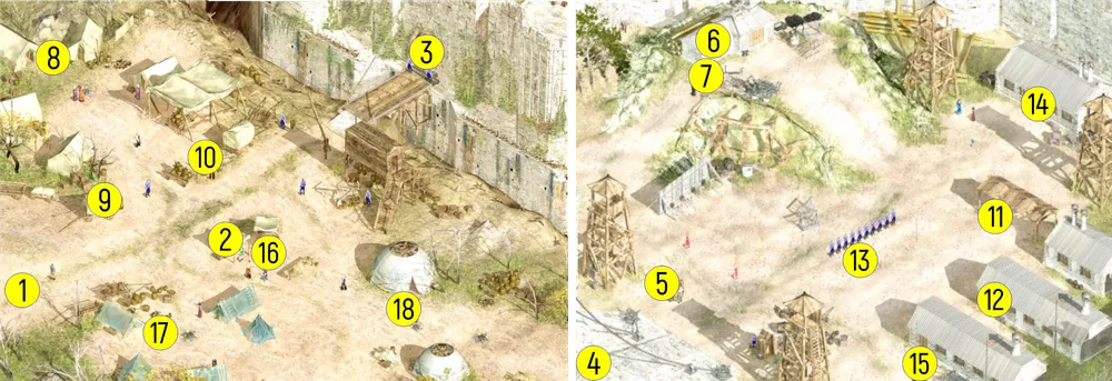 1 – место перехода на карту мира. 2 –Абдульхак ибн Акбар. 3 – вход на заставу. 4 – выход из заставы. 5 – лейтенант Сулимир. 6 – кузница. 7 – рядовой Лагач. 8 – Борис Ефимович. 9 – торговец заклинаниями. 10 – торговец зельями. 11 – волшебник Юша и снабженец Треска. 12 – жилище офицера. 13 – начальник гарнизона. 14 – дом капитана Луня. 15 – распорядитель соревнований. 16 – Немизь. 17 – Вялица. 18 – Вавула.