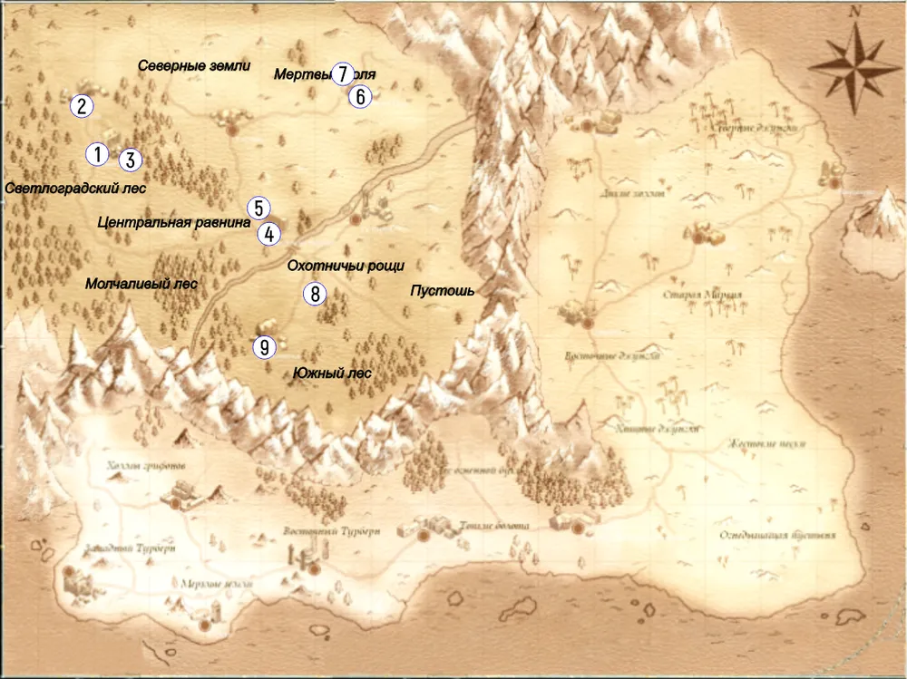 1 – Светлоград. 2 – Сом. 3 – логово разбойников. 4 – застава на Ра-реке. 5 – северный хутор. 6 – Девичье Поле. 7 – сухое дерево. 8 – Багровая роща. 9 – Велеград.