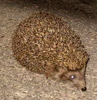 ○ Ест еж много и очень шумно, в его меню присутствуют ужи, жабы, жуки, кузнечики, а также земляника, малина, желуди и дыни. Жуков он придавливает лапой, после чего берет зубами, а вот с убегающей жертвой он сначала бежит рядом, а потом впивается в нее зубами. Также он ест яйца птиц, которые гнездятся на земле, это фазаны, тетерева, перепела и куропатки. Еж может заползти в огород, но не для того, чтобы разорить грядки. Он съедает гусениц и улиток, которые приносят много неприятностей огородникам. Видит еж очень плохо, но нюх у него прекрасный.