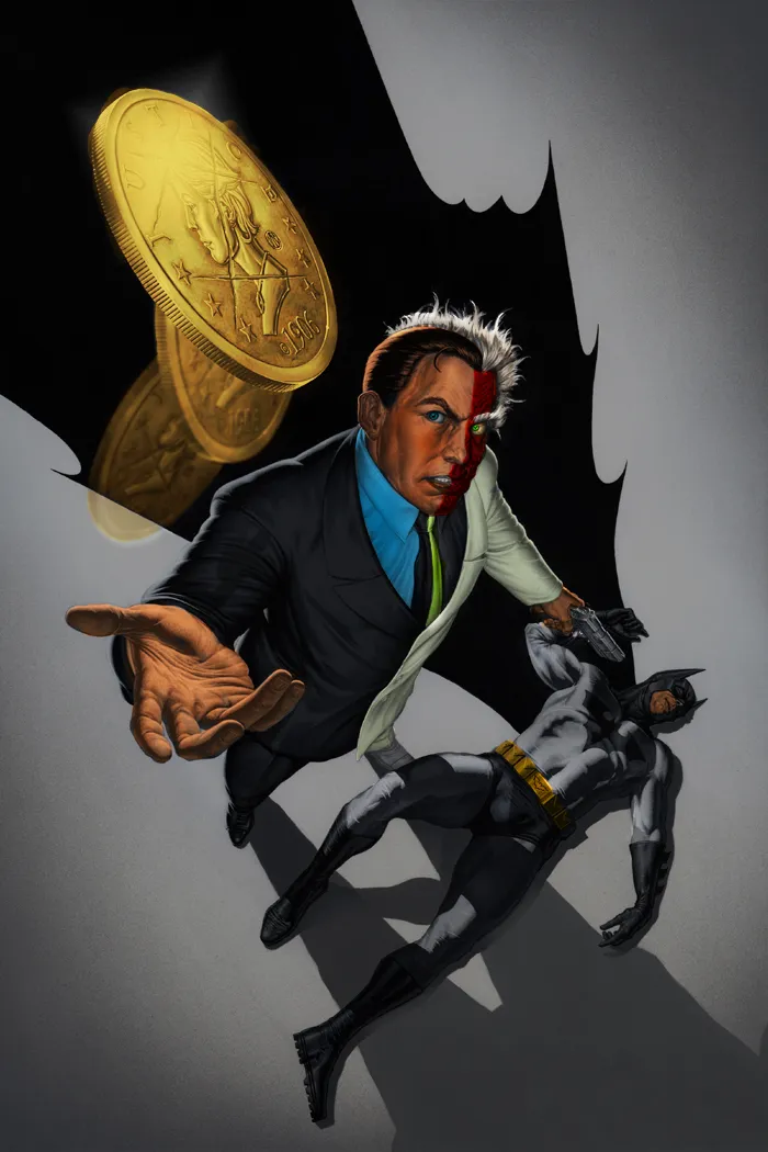 Фильмы: Ра‘с аль-Гуль, Джокер и Двуликий. Три очень «комиксных» персонажа. Но, как мы уже сказали, Бэтмен Нолана живёт в несколько более реалистичном мире, как и его противники. Так что вместо бессмертного Ра‘са нам дали обычного человека, чей дух способен пережить тело. Джокер тоже стал пореалистичней. Вместо мультяшного облика ему достались шрамы и уродство. И мы не знаем (и, наверное, никогда не узнаем), как он дошёл до жизни такой — тут нет ванны с химикатами, только ложь и полуправда. Даже Двуликий, в целом, стал обычным человеком, жизнь которого пошла под откос.