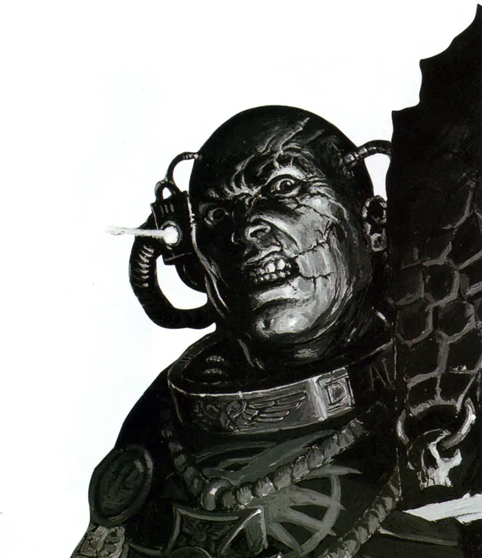 - А, Раскиль, вот и вы… — начала фигура, замершая при виде космодесантников. Когда человек повернулся к ним, пламя осветило его лицо под тяжёлым капюшоном мантии. Похожая на пергамент кожа свисала складками со щёк, а спина словно была вечно согбена. Из правой глазницы торчал странный оптический прибор с несколькими разнокалиберными линзами, то выезжавшими вперёд, то отъезжавшими назад, пока он фокусировал взгляд. Носа у него также не было, из середины бесформенного лица к маленькому цилиндру на поясе тянулся воздушный шланг.