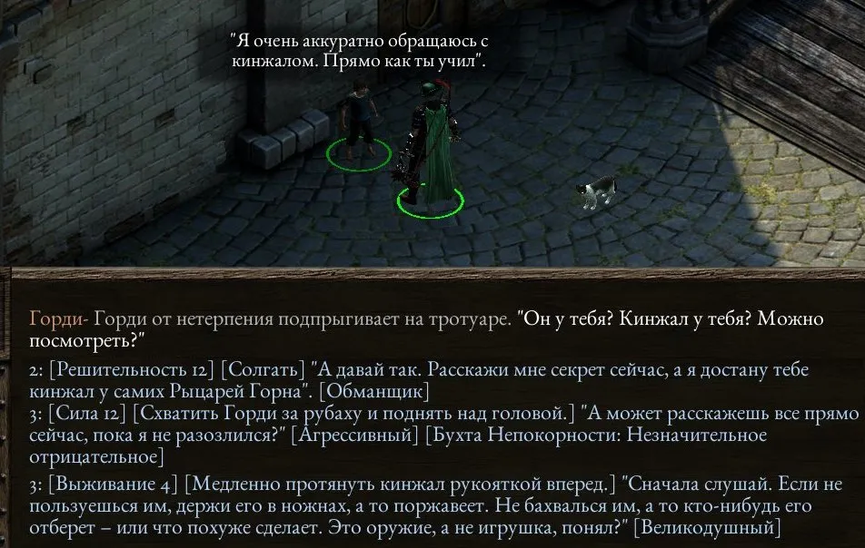 Ещё лучше сработал вариант с решительностью: репутация не упала, кинжал у героя, и даже более того — при повторном разговоре его можно вручить Горди (после диалога с отцом мальчика кинжал всё так же в руках героя).