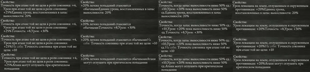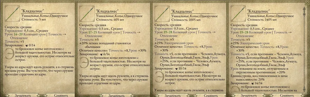 Слева направо: копьё до улучшения с помощью ответов на вопросы; после улучшения; улучшенное самостоятельно; улучшенное ответами на вопросы после самостоятельного улучшения. Если вместо точности и урона добавить парализацию или восстановление выносливости – выйдет совсем неплохо.