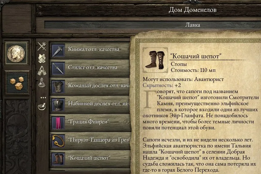 Получив на уши лапшу о «трагической участи» эльфа, Бриканта обрадуется и откроет магазин предметов снаряжения для авантюриста, где среди прочего окажутся сапоги скрытности +2; можно было не добиваться их «выпадения» в начале игры.