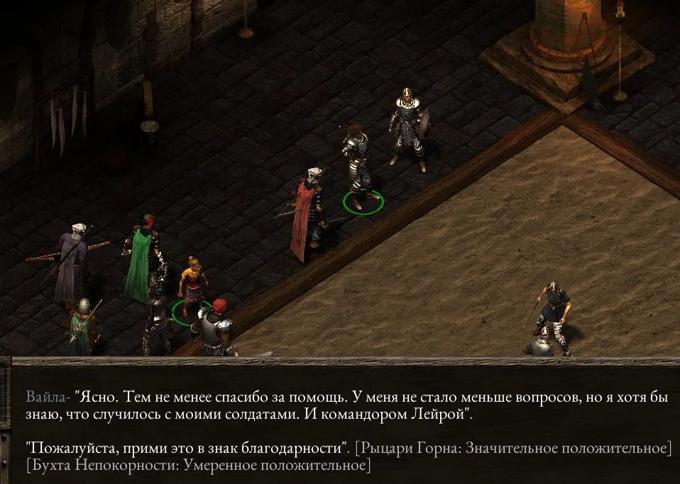 либо отпустить, получив в подарок ту же шляпу (кто соврал дважды, соврёт и в третий раз). Вот втором случае отряд не получит падения репутации в глазах Бухты Непокорности (что важно для личного квеста Эдера), а Перегунд, появившаяся на рынке, не предоставит отряду скидку.