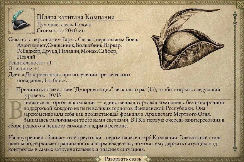 К слову, о шляпах: купленная в Компасе Анслойга шляпа Капитана Компании в какой-то момент совершенно перестала выполнять требование «Дезориентации», необходимое для повышения её уровня. (Очевидно, враги стали слишком сильны и не поддавались её воздействию.)