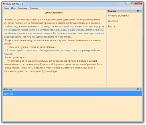 QSP - система для разработки текстовых игр с простым синтаксисом и кроссплатформенным проигрывателем. Подходит для создания РПГ, стратегий и головоломок. Играть легко: просто запустите игру через меню. Доступна на Windows, Linux, PSP и других платформах.