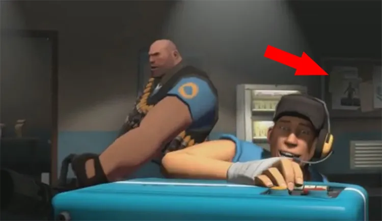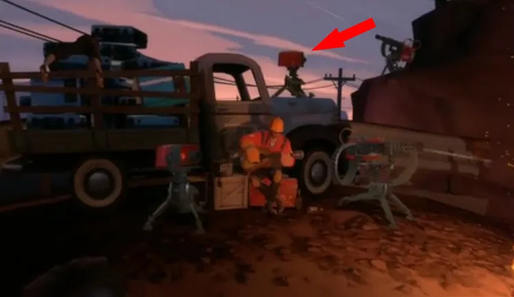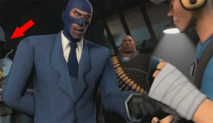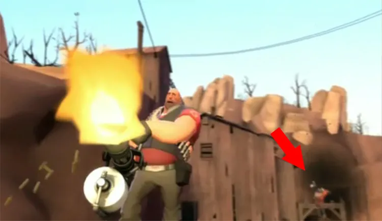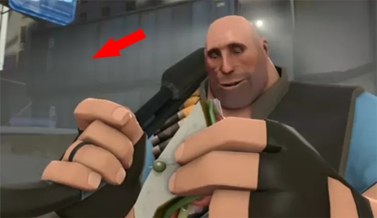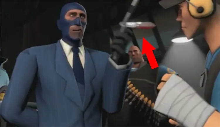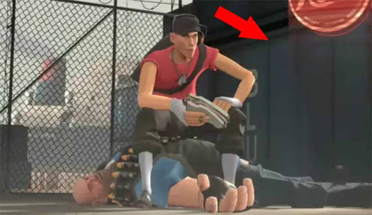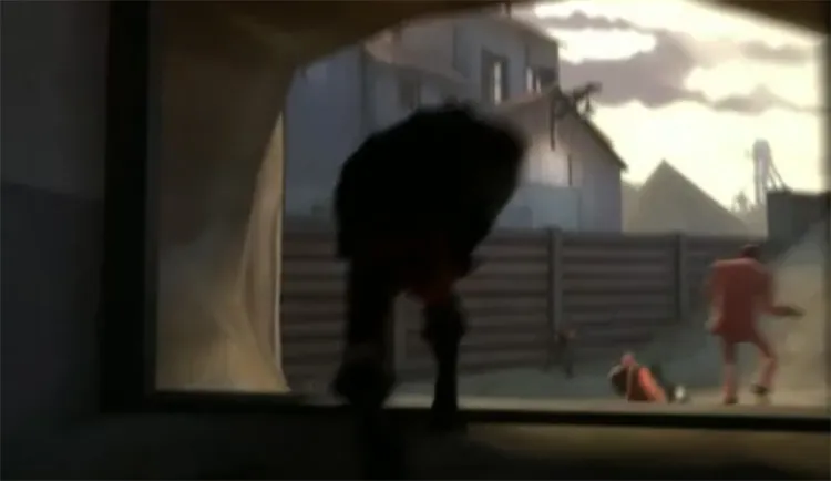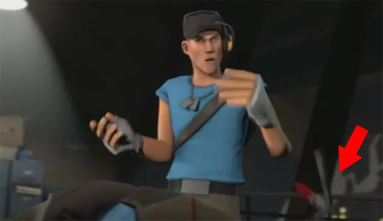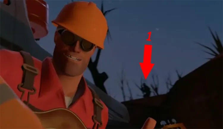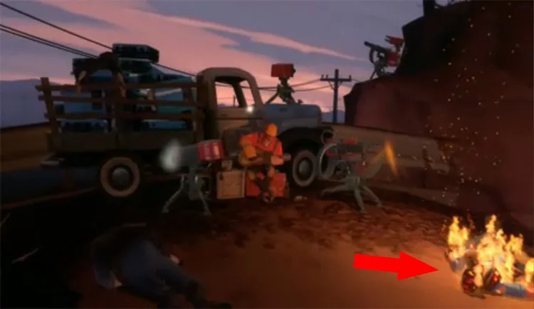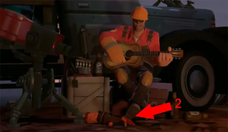 На протяжении всего ролика можно заметить, что Инженер сидит у костра. На самом деле, это не костёр, а горящий труп синего Снайпера.