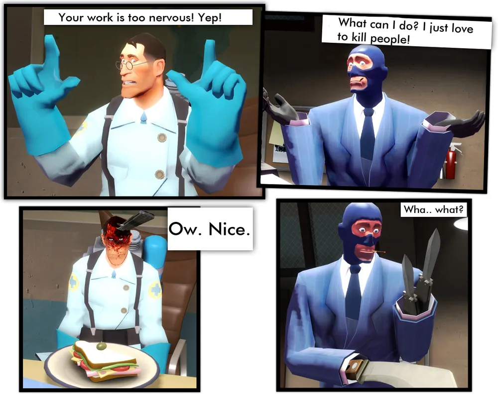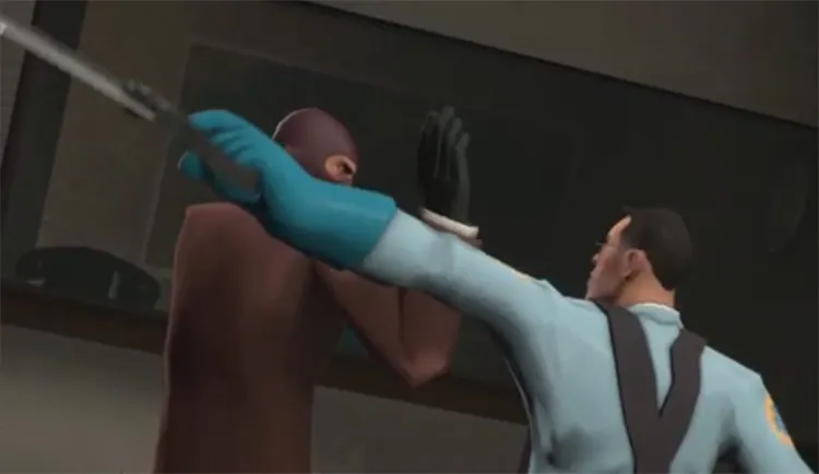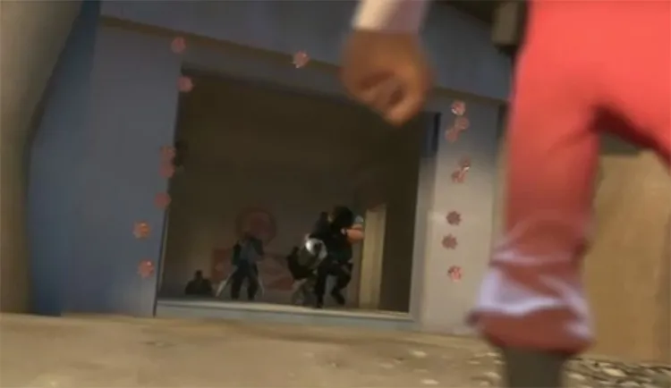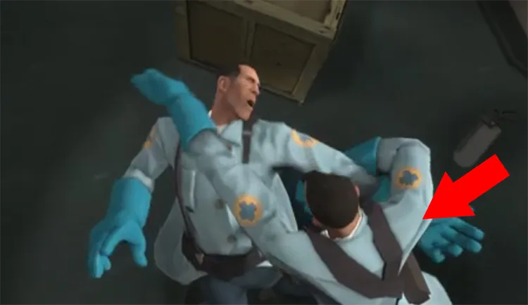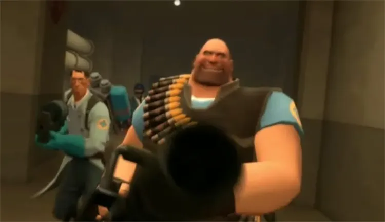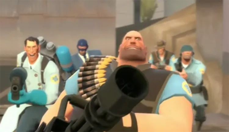 Судя по ролику, можно сказать, что в команде синих одни идиоты. Только посмотрите, в толпе бежит синий Шпион, без всякой маскировки! И Снайпер с винтовкой, которая эффективна только когда стреляешь из далека, да и Медик, почему-то, не хилит своего Хэвика.