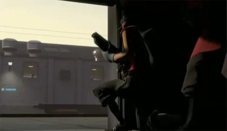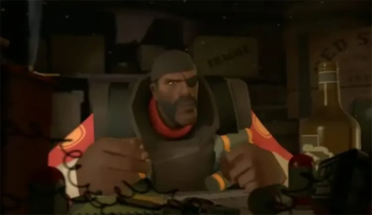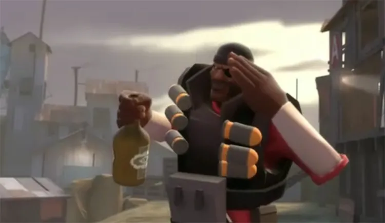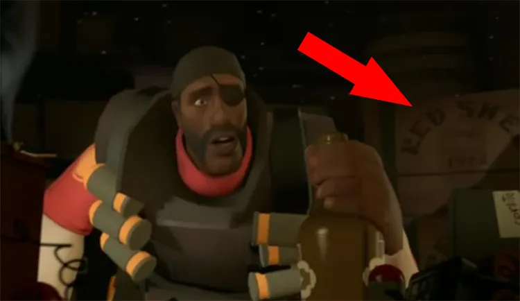 Видите эти ящики, которые стоят за спиной у Демомана? По ним можно сказать, что он частенько употребляет спиртное. Как никак Red Shed - это пиво, которое стояло и у Инженера, и в ролике Сэндвича.