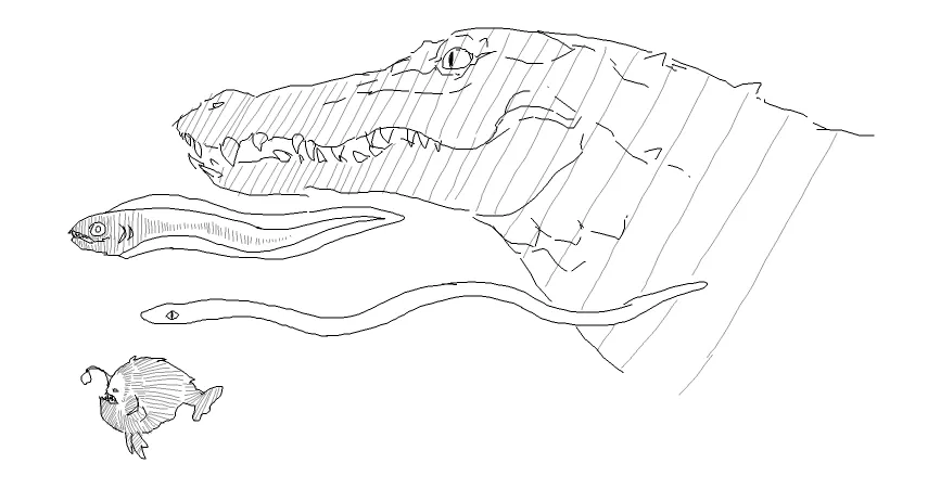 Нейтральные рыбки-черти живущие по краям карты, пассивно-агрессивные электрические угри, агрессивные ядовитые змеи встречающиеся ближе к джунглям, и сам, злобный обитатель подводных джунглей - Аллигатор.