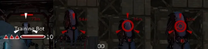 А вот так в экшен-режиме меняется внешний вид прицела, в зависимости от наносимого врагу урона – от гарантированного промаха (белый прицел) до максимального урона (два кружка в центре):